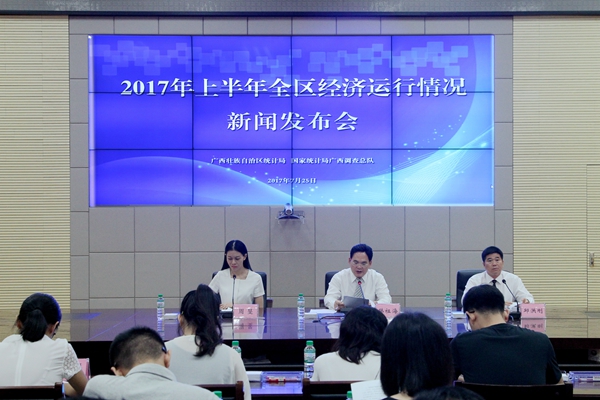 7月25日上午,自治区统计局与**统计局广西调查总队联合召开上半年全区经济运行情况新闻发布会。自治区统计局总统计师、新闻发言人韩祖海发布了2017年上半年全区经济运行情况,并与**统计局广西调查总队副巡视员邱洪刚共同回答记者提问。发布会由自治区统计局综合处处长周旻主持。
